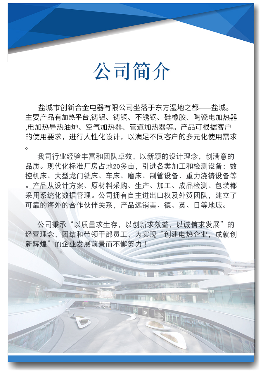 歡迎訪問(wèn)鹽城市創(chuàng)新合金電器有限公司官方網(wǎng)站!主營(yíng)產(chǎn)品:加熱平臺(tái),鑄鋁加熱器,鑄銅加熱器,陶瓷加熱器等